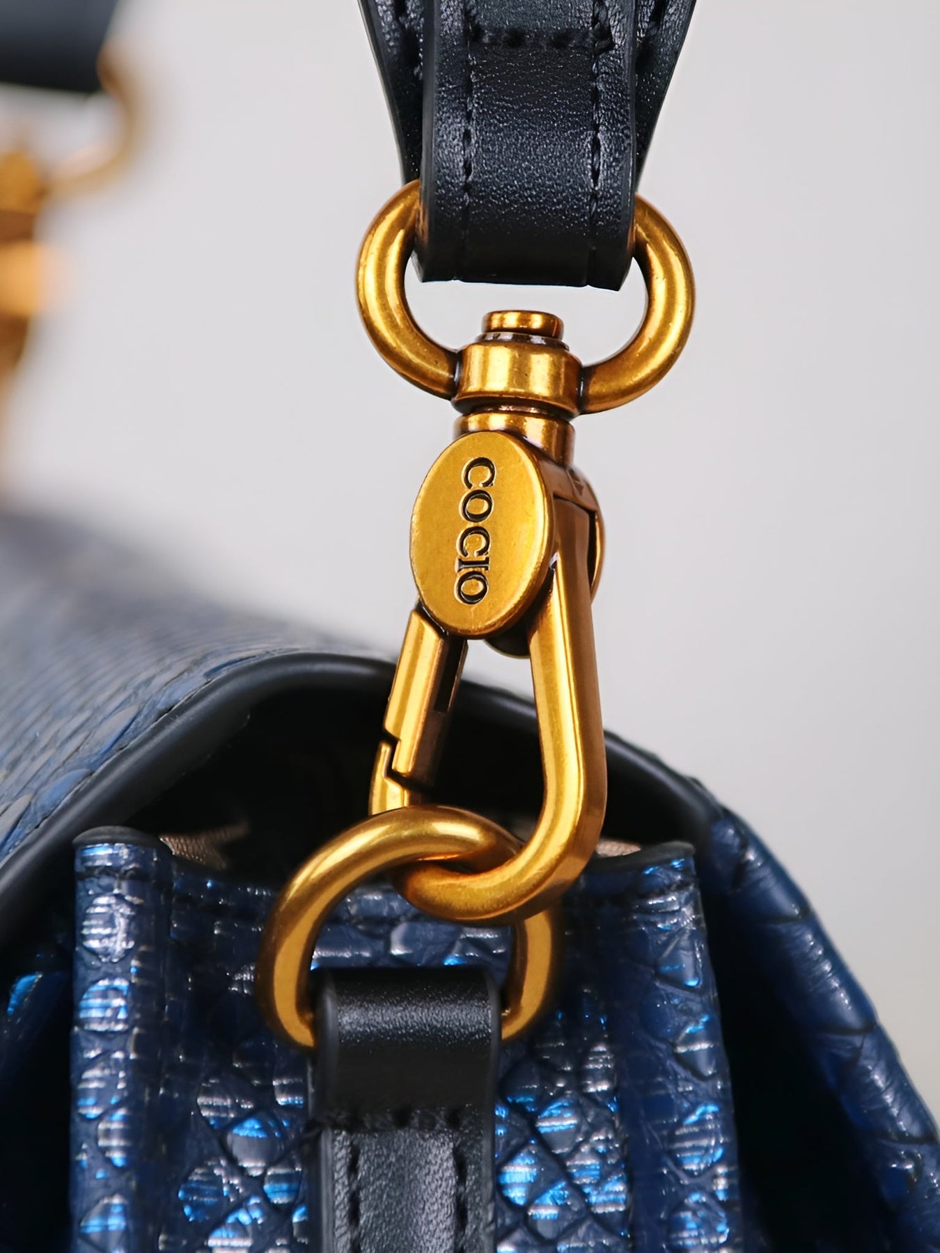 تتباين خطوط فضية زاهية مع الأزرق الملكي الأنيق، مما يخلق بريقًا فريدًا على قماش جلد الثعبان النباتي البارز. تحدد الطيات اللطيفة على الجانبين الهيكل الصندوقي، بينما تضيف المشبك الأسود والحزام لمسة خفية لمظهر أنيق وبسيط.