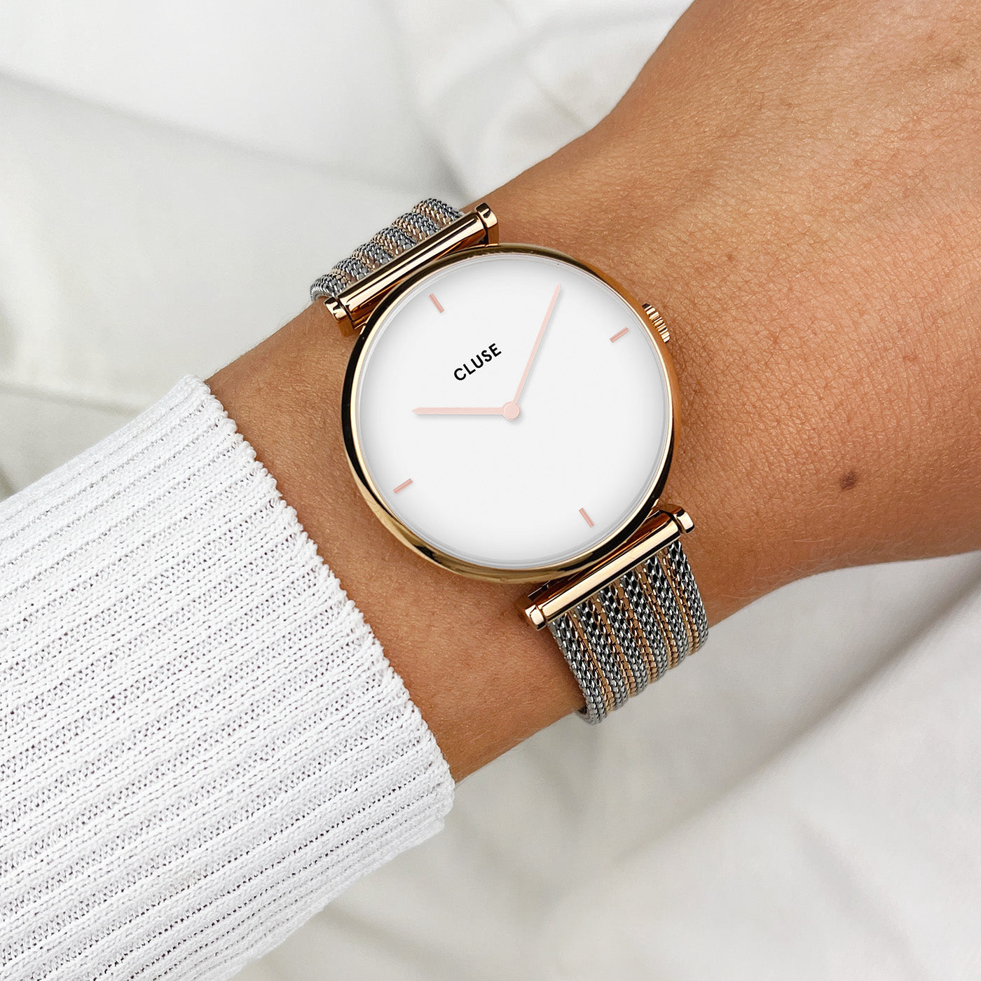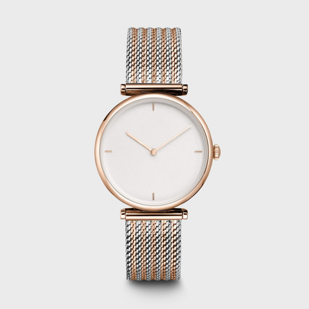 احتضن الأناقة البسيطة مع هذه الساعة الثنائية اللون الأنيقة، المصممة بمزيج رائع من الفولاذ المقاوم للصدأ لأسلوب متنوع بشكل طبيعي. تصميم T-bar يوفر شكلًا سلسًا ومُصقلاً، بينما وجه الساعة المعدني مع توهج ناعم يلتقط الضوء بشكل جميل، مما يجذب جميع الأنظار إلى معصمك.